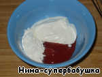 Тщательно смешать сметану, кетчуп, муку и молоко, добавить мелко нарезанную зелень.