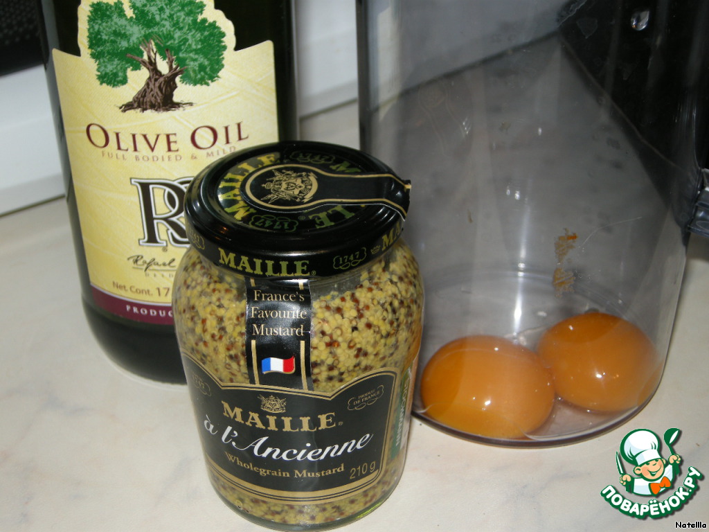 Берем 2 желтка (лучше деревенских яиц), 1 зубчик чеснока, 1 ч.л. горчицы "Дижон".