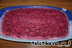 Для свекольного слоя, смешать свеклу с чесноком и сметаной, посолить.