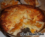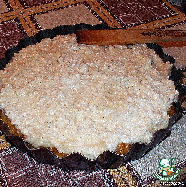 В смазанную сливочным маслом форму выкладываем половину массы, на нее слой тыквы, потом снова творожную массу. Разравниваем и помещаем в духовку.