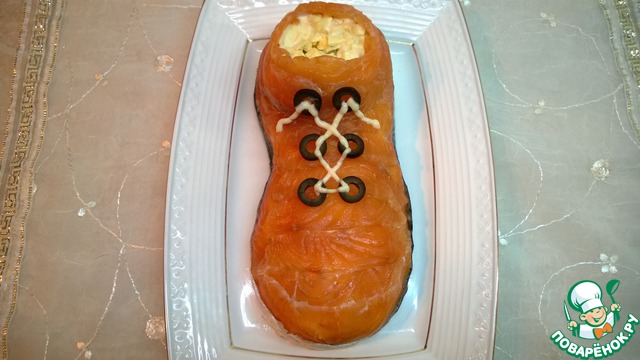 Переносим с помощью лопаточки нашу рыбную заготовку на тарелку, в которой будем подавать закуску, и продолжаем выкладывать салат, чтобы получилась форма ботинка. Делать это несложно, главное условие: не добавляйте много майонеза в салат, иначе он растечется, и смотреться это будет неэстетично.