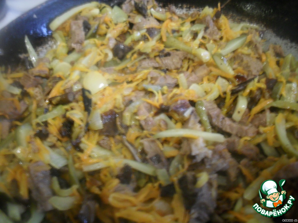 • Лук нарезать четвертинками колец, морковь натереть на средней терке, обжарить на растительном масле до золотистого цвета.