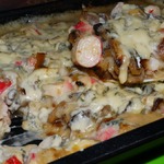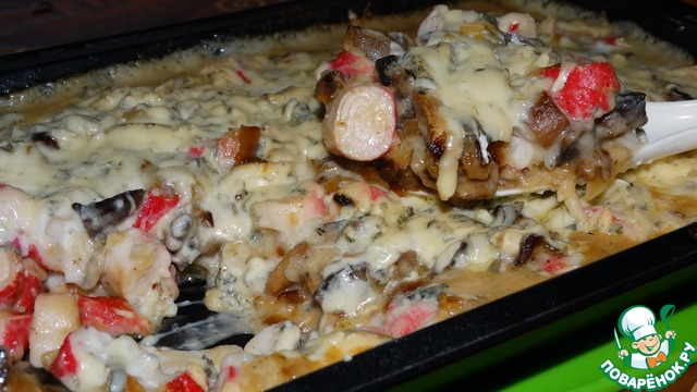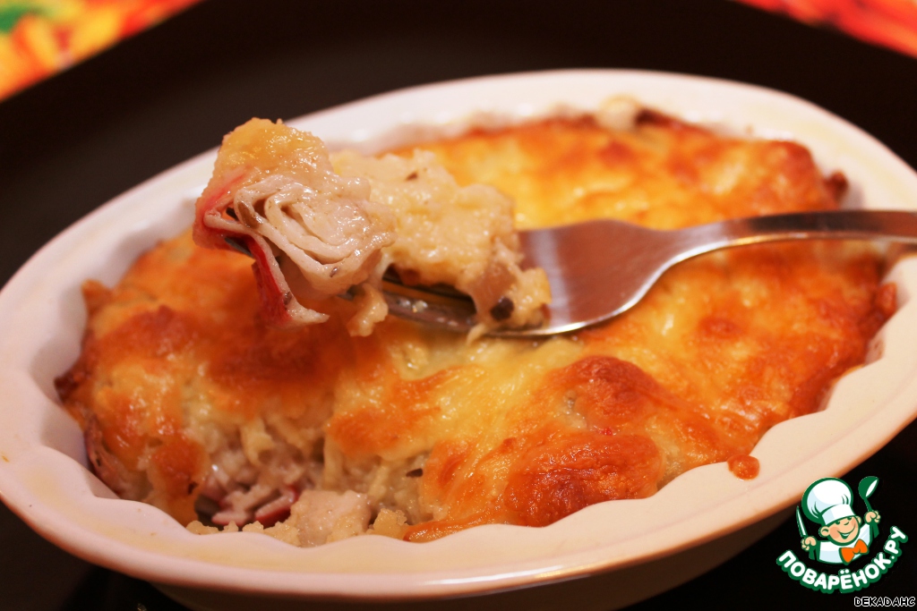 Формы-кокотницы смазать слегка маслом, выложить обжаренные крабовые палочки с грибами, залить все готовым соусом и аккуратно перемешать. -