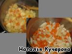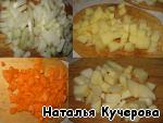 Мелко порезать лук, морковь и яблоко. Очистить картофель и порезать кубиками. В 3 ложках оливкового масла потомить лук и морковь.