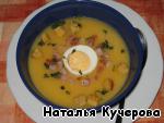 Подавать с вареным яйцом, сухариками и бейконом (или хамоном или пармской ветчиной, порезанными на мелкие кубики). Также можно украсить зеленью.