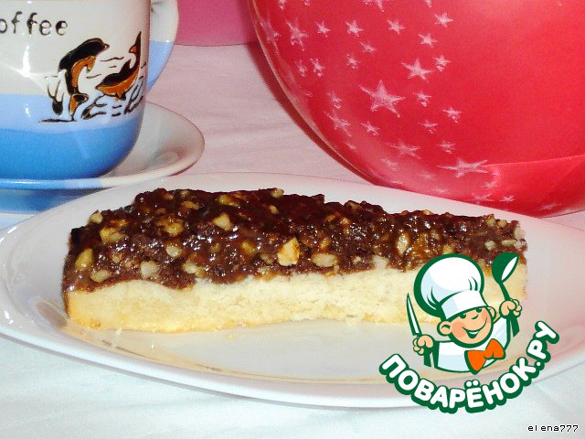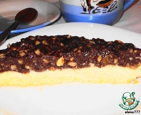 Рецепт этого блюда был размещeн в 2008 году пользователем lesi под названием "Карамельно-оеховый торт" и иллюстрирован мной в рамках акции "Раскраски". Тортик получился вкуснейший, с рассыпчатой основой и шоколадно-ореховой верхушкой, по вкусу напоминающий батончик "Сникерс".