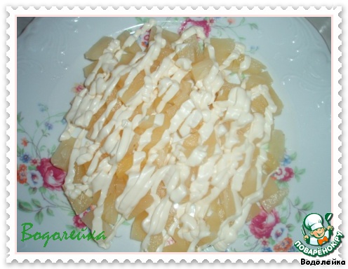 4 слой - натертый на мелкую терку сыр. Этот слой промазать тонким слоем майонеза (можно, конечно, этого и не делать, но... сыр имеет такое свойство как обветривание, и после салат смотрится не очень красиво)