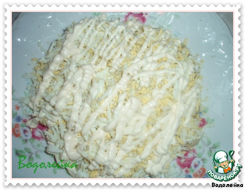 2 слой - натертые на терку яйца (я терла на мелкую) + немного майонеза