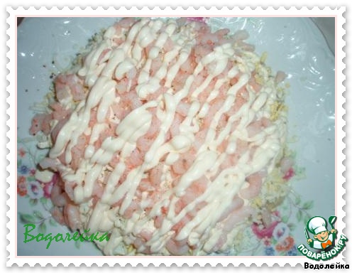 3 слой - креветки (немного отложить для украшения) + немного майонеза -