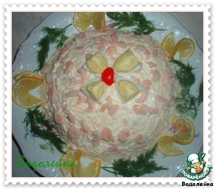 Дальше украшаем по желанию. Я украсила кусочками яйца, оставшимися креветками, дольками лимона и зеленью.