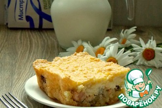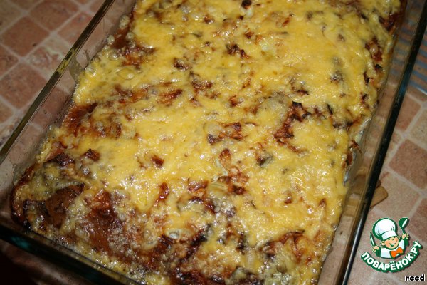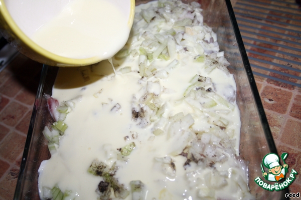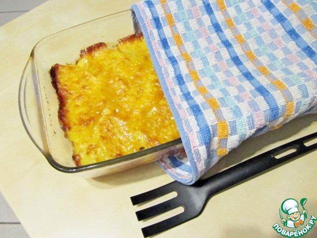 Сливки взбить с яйцами. Запеканку залить и поставить в нагретую духовку на 30 минут. Затем вынуть ее из духовки, посыпать тертым сыром и дать еще постоять в духовке, пока сыр не зарумянится. Температура запекания 250 градусов.