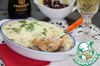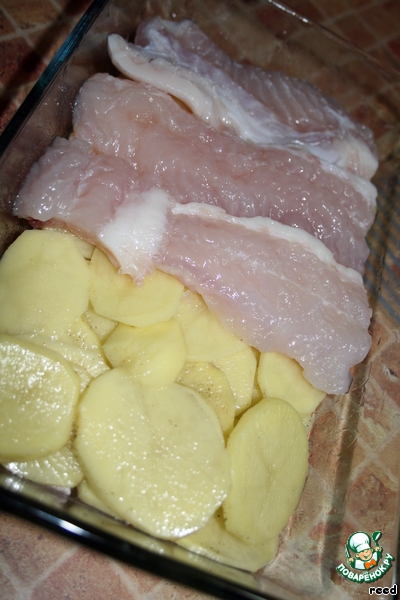 Рыбное филе нарезать полосками и выложить на картофель вплотную друг к другу.