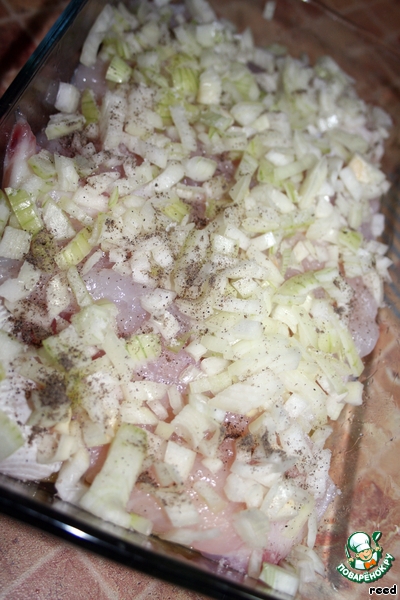 Лук мелко нарезать и выложить на рыбу, равномерно распределить. Посолить и поперчить. Можно насыпать сверху еще немного муки.