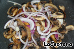 Когда шампиньоны станут золотистыми, добавим красный лук, порезанный полукольцами. Потушим 2 минуты.