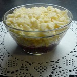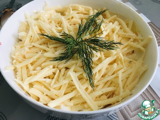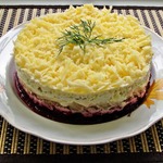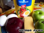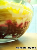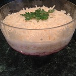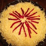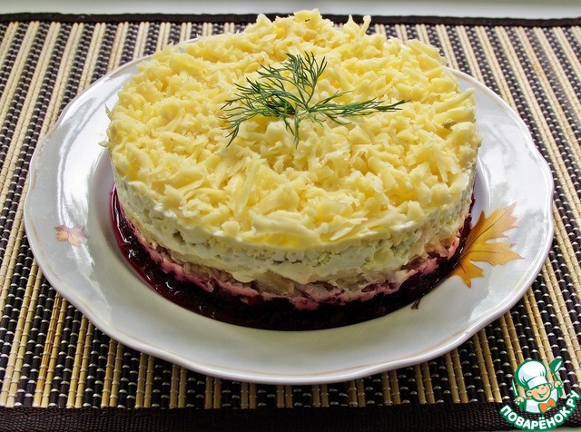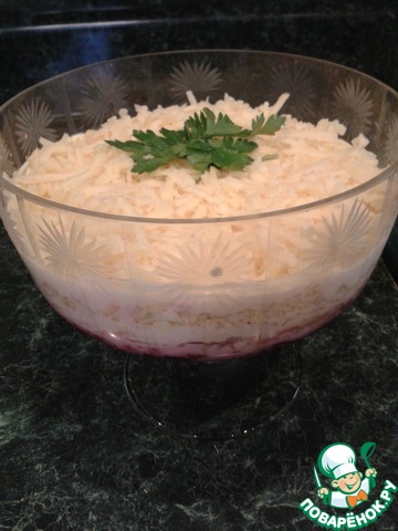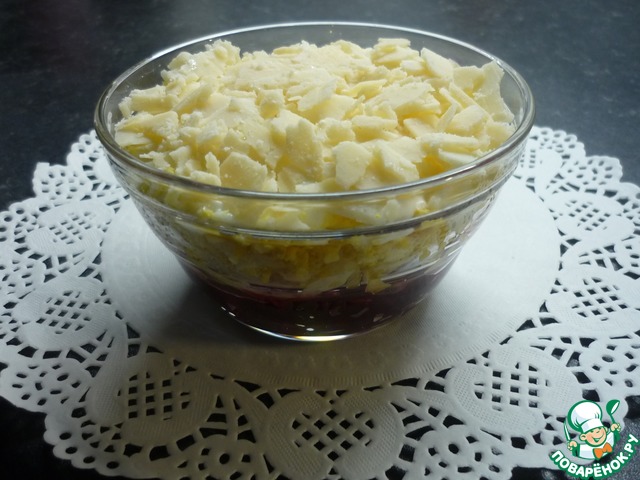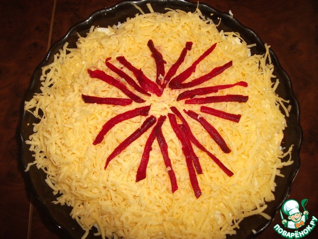 Свеклу натереть на крупной тёрке, сверху сделать "сеточку" из майонеза.