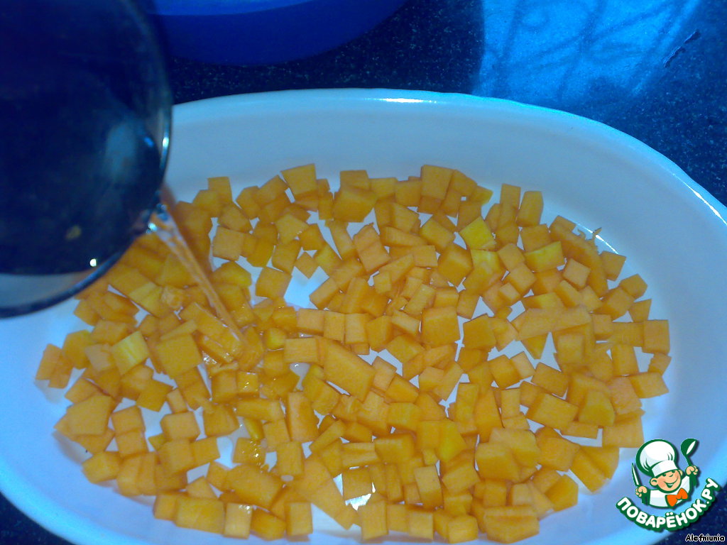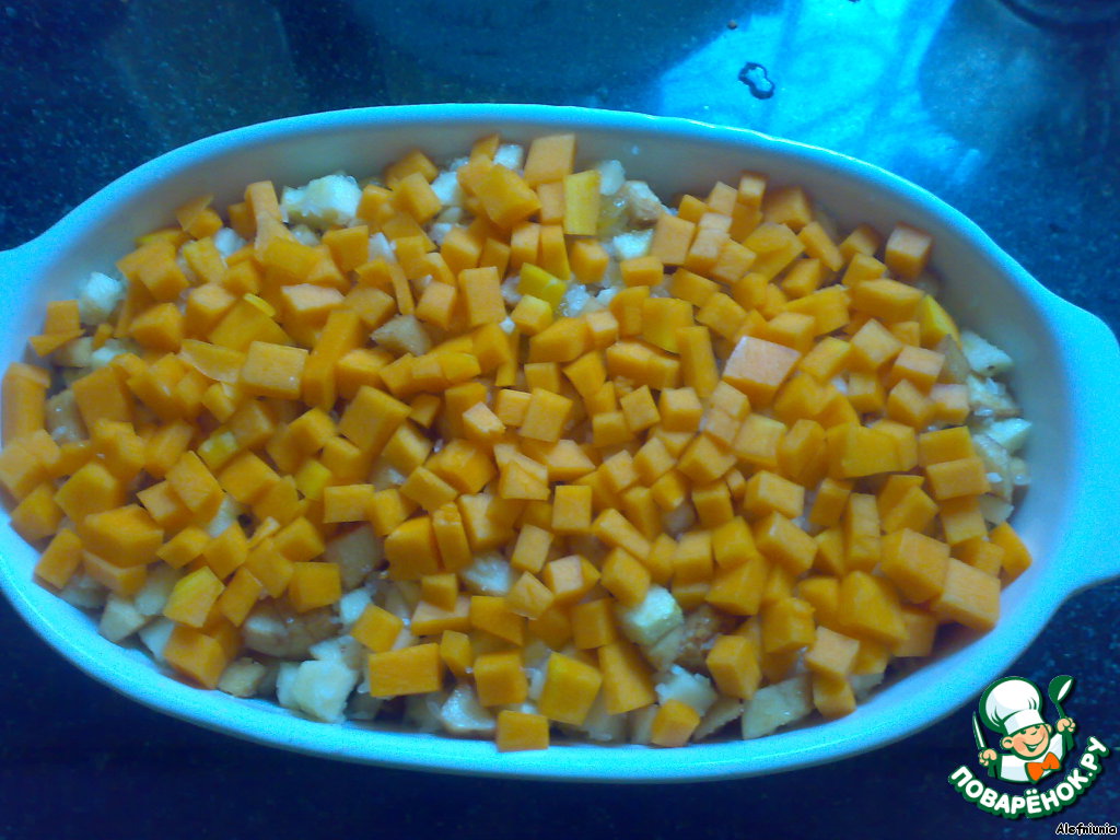 На дно формы выложить 1/2 тыквы.