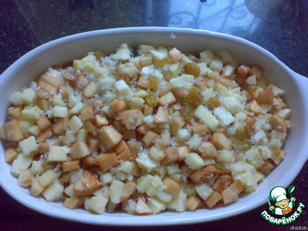 Смешать яблоки, айву, сырой рис, сахар, изюм, соль. Хорошо перемешать.