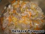 Далее слить воду. В кастрюлю с желудками добавить 1 стакан воды и довести до кипения. Затем добавить натертую на терке морковь, лавровый лист, перец, соль, мелконарезанный лук. Перемешать. |