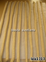 Тесто раскатать в пласт и разрезать его на длинные жгуты.