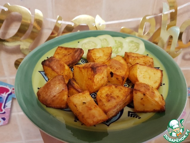 Противень хорошо смазать оливковым маслом и высыпать картошку, печь при 200 гр, 20-30 минут, при этом за это время картошку 2 раза помешать.