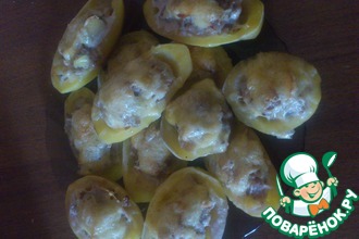 Ставим картофель в духовку (причем если Вы забыли заранее разогреть ее, то на вкусе нашего блюда это совсем никак не отразится, но все-таки лучше ставить в разогретую - быстрее приготовится) и опять забываем о готовке минут на 40. Если уж очень голодные, то можно и через 30 минут съесть одну половинку, но лучше все-таки выдержать время. А без шуток, то готовность проверяем, перевернув половинку картофеля и внимательно изучив его разрезанную поверхность. Если она покрыта аппетитной корочкой - значит, ГОТОВО!