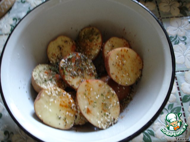 Смазываем растительным маслом форму (сковороду побольше или же просто противень), выкладываем наш "промаринованный" картофель разрезом вниз.