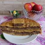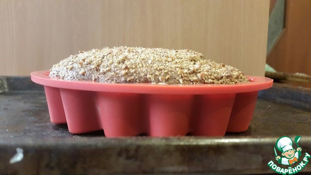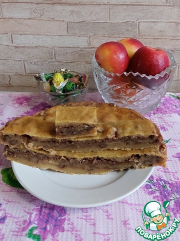 Сверху насыпаем 1/2 ореховой смеси. На нее опять 1/3 теста и сверху - орехи с корицей. И оставшуюся часть теста. Ставим в духовку минут на 50-60 при температуре 170 градусов.