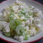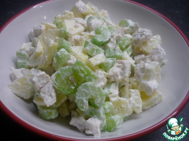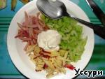 Как равноценный вариант вместо копченой курятины можно использовать слабосоленую семгу или же острый сыр, также нарезанный соломкой. В вариацию с сыром хорошо вписываются мелко рубленные грецкие орехи.