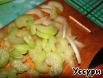 Черешковый сельдерей разбираем на стебли, моем и режем поперек острым ножом. Для сравнения на всех фотографиях приведена спичка.