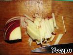 Яблоко режем на четвертушки, удаляем сердцевину, режем на пластинки и соломкой.
