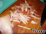 С копченого куриного окорочка (или грудки) удаляем кости и кожу, режем пластинками и соломкой.