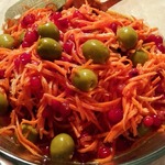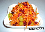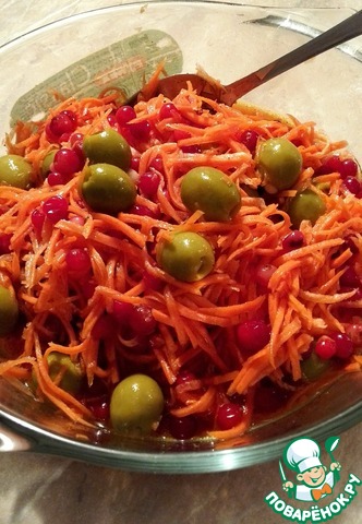 Морковь натереть на тёрке, добавить оливки и бруснику.
