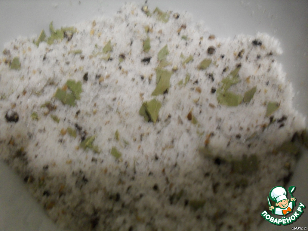 Из пряностей чуть увеличила дозу кориандра - до 0,5 ч.л. Но у меня он уж очень хорош - индийский, с легким лимонным ароматом. И лаврового листа - 5 штук свежего. Соль - 3 стандартных столовых ложки, по 17 г (крупная). Количество оптимальное. Сухой посол очень удобен и прост.