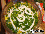 В посуду (красиво, если она прозрачная) разминаем вилкой и выкладываем слой творога, после солим и перчим по вкусу и добавляем майонез.