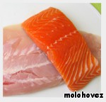 Нам понадобится 2 сорта рыбы. Белая у меня в 3 раза дешевле красной, и я ее взяла побольше, чем указано в рецепте. Пока занимаемся белой, красную можно положить в морозилку, тогда ее легче нарезать на пласты.