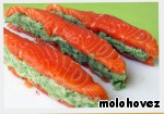 Лосось нарезаем аккуратными ломтиками (примерно, по 70г). На порцию - 2 ломтика. Нижний ломтик промазываем фаршем из белой рыбы и прикрываем другим. В оригинале, высота начинки 1см, но я положила больше фарша.