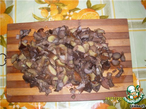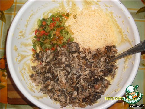 • Обжаренные с курицей грибы, натёртый сыр, нарезанный кубиками перец и измельчённую зелень... Всё хорошенько перемешать