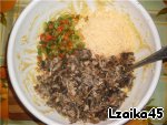 Обжаренные с курицей грибы, натёртый сыр, нарезанный кубиками перец и измельчённую зелень... Всё хорошенько перемешать