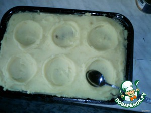 Затем выложить вторую часть картофельного пюре и ложкой сделать глубокие круглые углубления.