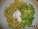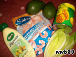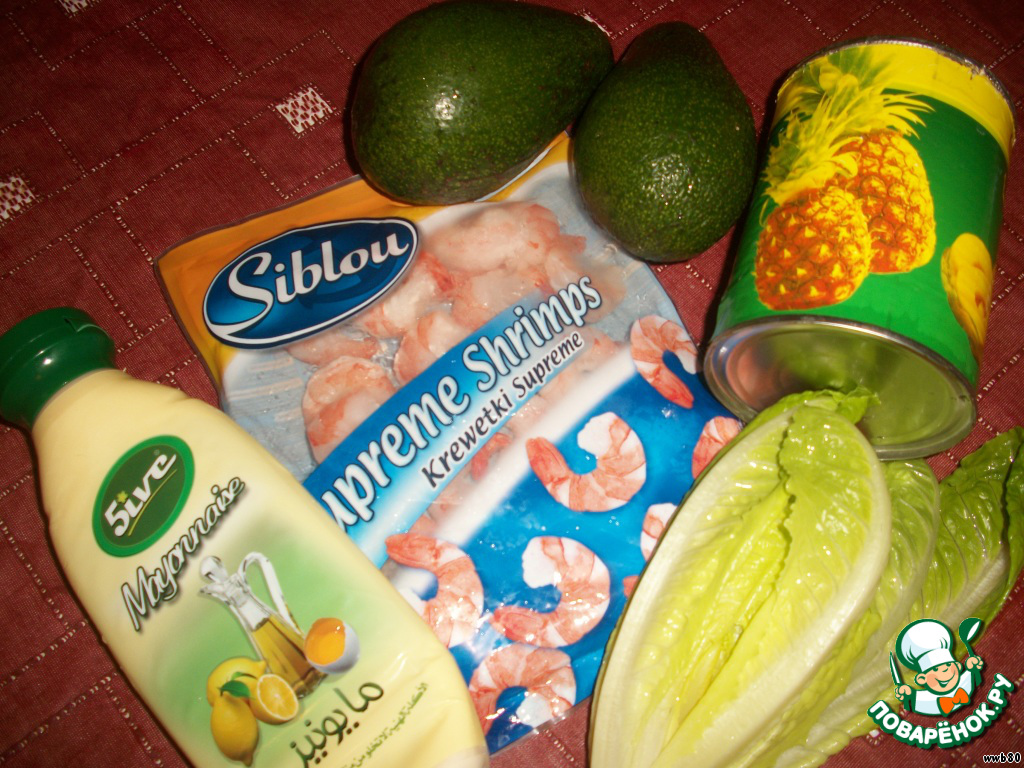 Креветки, ананас, салат, авокадо смешать с майонезом.