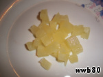 Консервированные ананасы у меня были кружочками. Нарезать кубиками.