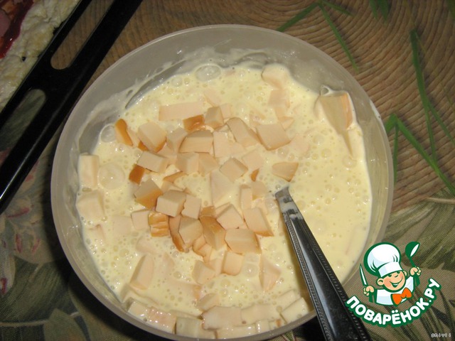 • Приготовить заливку. Соединить вместе все ингредиенты для нее. Сыр нарезать кубиками, можно покрупнее до сантиметра. Все тщательно размешать.