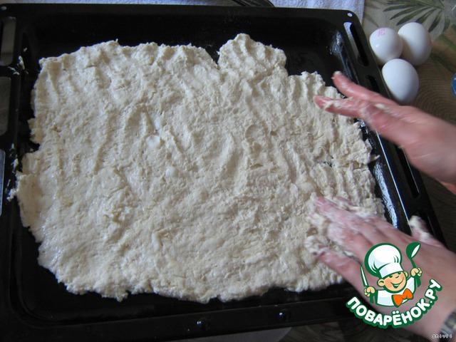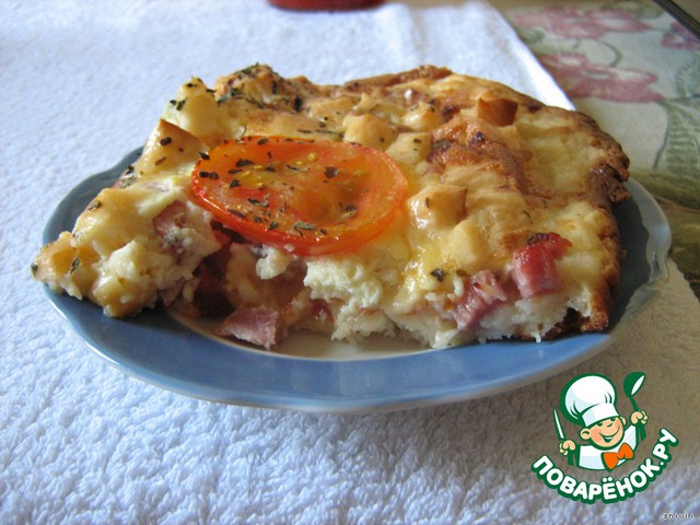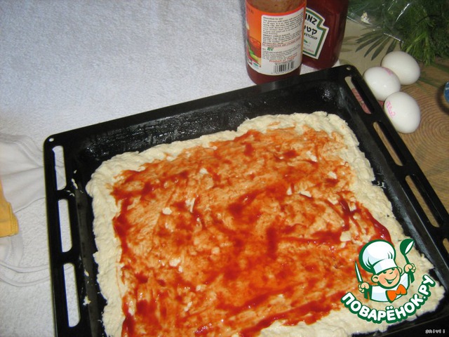 Рецепт этот полностью мой. Разве что тесто общеизвестное. Обычное, на кефире. А вот идею подсказала мне давным-давно какая-то передача про Сицилию. Там пиццу не просто посыпают сыром, как принято везде, а делают специальную заливку...