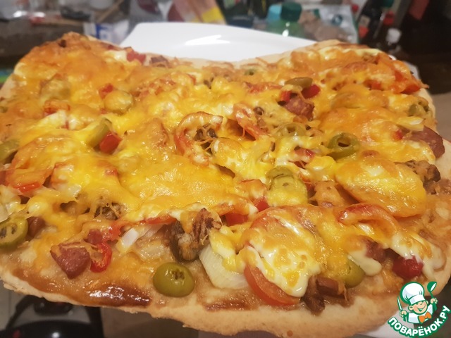 Это мой домашний рецепт. Юра его облагородил. И он упомянул, что забыл добавить орегано - а это один из главных ингредиентов этой пиццы, и добавить сырой лук и колбасу копченую вместо бекона. Так вкус будет совершеннее. Спасибо за интерес к моему рецепту!