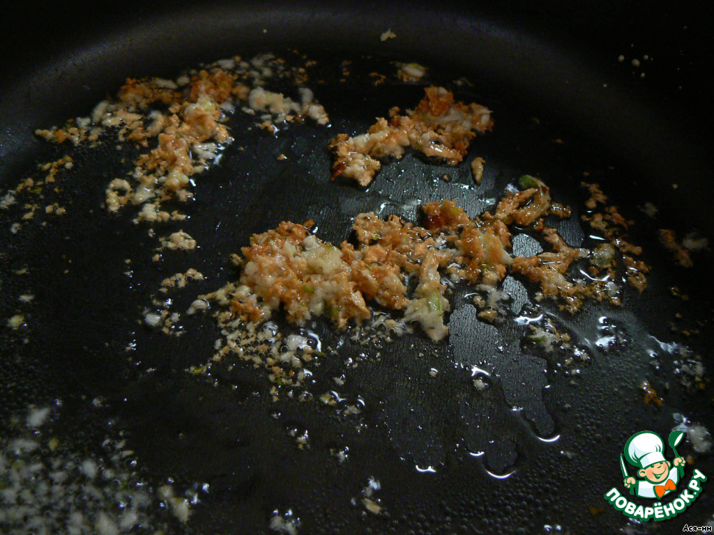 На раскаленном масле обжариваем мелко порубленный чеснок до золотисто-коричневого цвета.