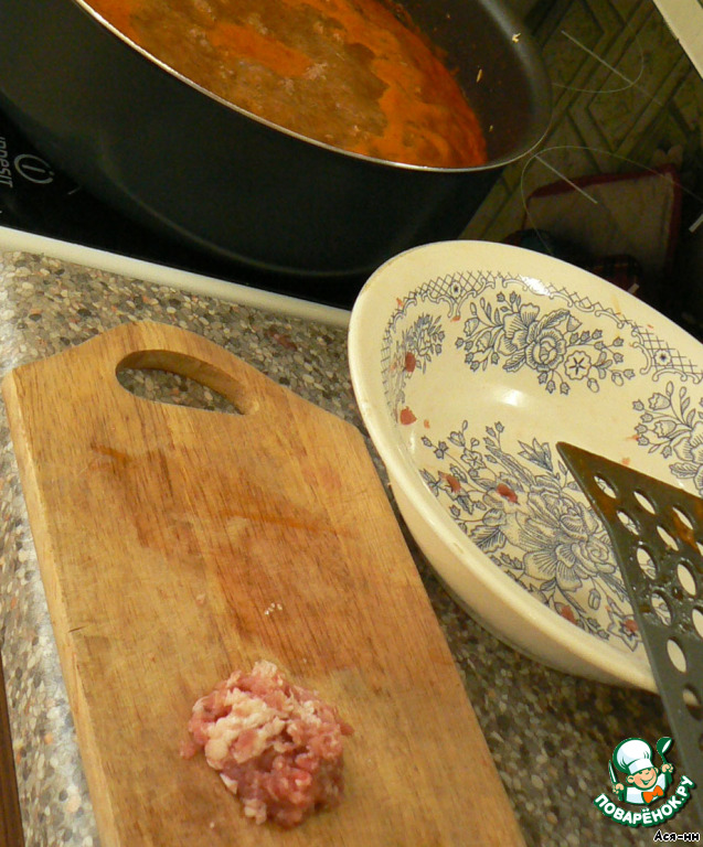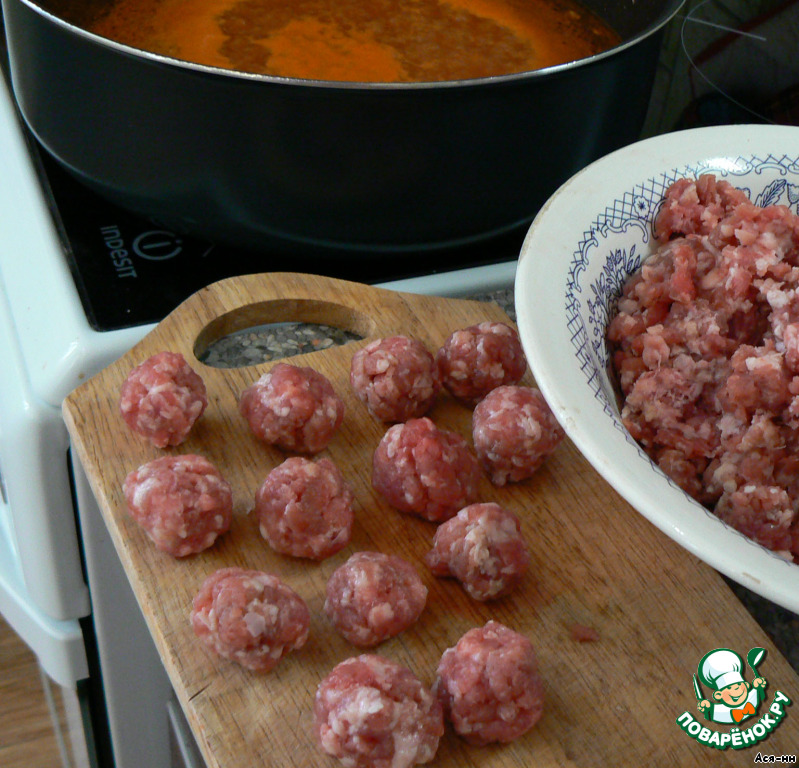 Пока соус закипает, ставим воду для отваривания спагетти. Формируем небольшие тефтельки из фарша. Когда соус закипит отправляем туда тефтельки.