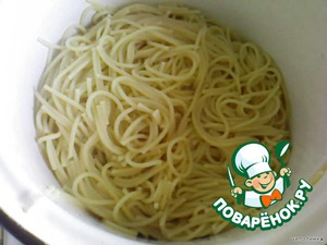 Спагетти отварить в подсоленной воде, откинуть на дуршлак и вернуть обратно в кастрюлю.