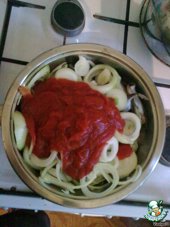 Поверх мойвы положить лук и томатную пасту.