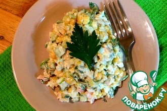 Добавляем водоросли сивит (тоненькая "лапшичка" насыщенного ярко-зеленого цвета + кунжутик). Всё аккуратно перемешиваем. Готовим заправку: смешиваем сок половины лимона, растительное масло, соевый соус. Заправляем салат.