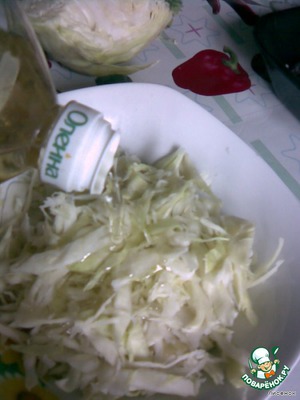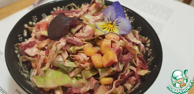 Kапусту соединить с оставшимися продуктами и заправить соусом.